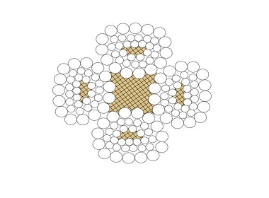 在煤矿救援钢丝绳设计过程中,需要解决的问题是钢丝绳在使用过程中不旋转。不旋转钢丝绳有两类结构:一种是多股不旋转结构,比如19×7等;另一种是少股不旋转结构,如4V×39S等。抗旋转能力,4V×39S优于19×7;使用及结构稳定性,4V×39S优于19×7;柔软性4V×39S差于19×7;耐磨损性上4V×39S与19×7相比,其股的最外层钢丝直径更大,意味着具有更好的耐磨损性,总体上说,4V×39S钢丝绳更适合煤矿救援使用工况。把铜缆涂塑绝缘后,放置在随股一起转动的4V×39S的外层股中,是一种比较优化可行的方案。为此确立了煤矿救援钢丝绳结构形式如图1所示,四股钢丝中心都有一根特制的符合煤矿安全要求的通信电缆。